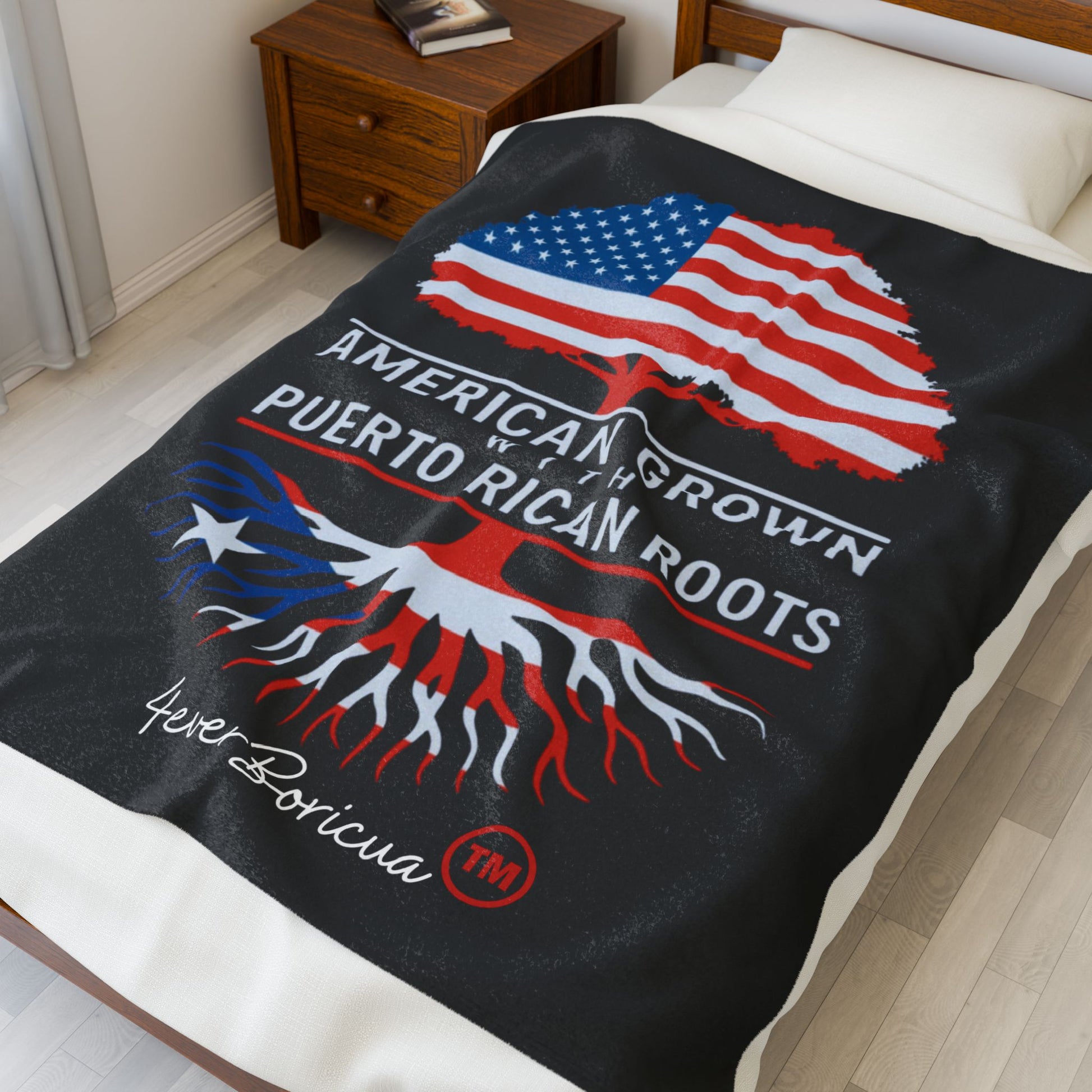 50x60 American Grown with Puerto Rican Roots Throw Blanket – Manta Patriótica para Boricuas en la Diáspora | 4EVERBORICUA
