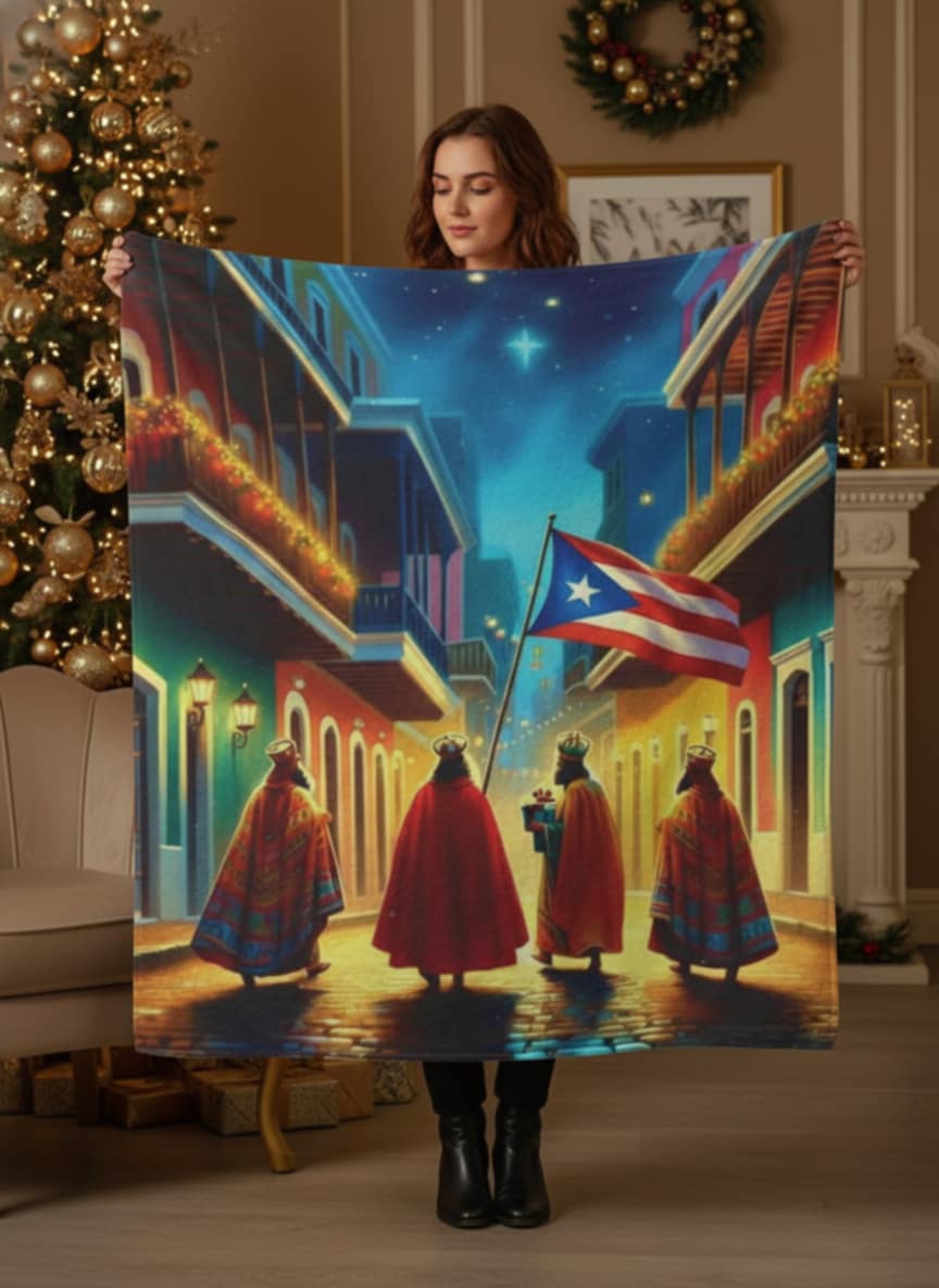 Celebra la magia de la Navidad con esta hermosa manta decorativa exclusiva de 4EVERBORI que muestra a los Tres Reyes Magos y al Niño Jesús en Puerto Rico. Diseño con derechos de autor, impreso por un solo lado, ideal para quienes aman las tradiciones boricuas y desean decorar su sala o dormitorio con un toque cálido y festivo.
